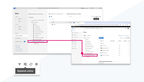 Aby przejść do wybranego folderu, kliknij polecenie Wyświetl online. Obsługiwane są wszystkie regiony usługi Autodesk Construction Cloud.