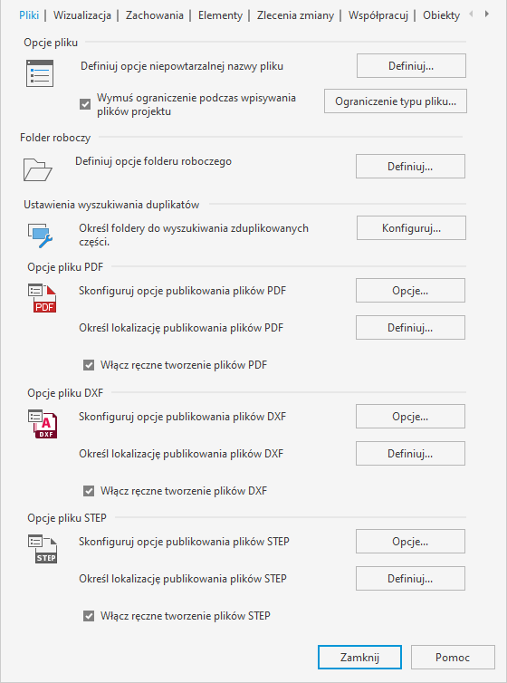 Karta Pliki w oknie dialogowym Ustawienia programu Vault zawiera opcje umożliwiające wymuszanie niepowtarzalnych nazw plików, wyłączanie wpisywania plików projektu, określanie opcji folderu roboczego i wyszukiwanie duplikatów.