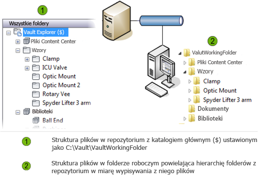 Do rozpoczęcia pracy z repozytorium nie jest konieczne określenie folderu roboczego, ponieważ jest on zdefiniowany domyślnie jako Moje dokumenty\Vault. Można jednak zmienić położenie folderu roboczego za pomocą polecenia Ustaw folder roboczy. Administratorzy mogą także wymusić standardowe położenie folderu roboczego dla wszystkich użytkowników.
