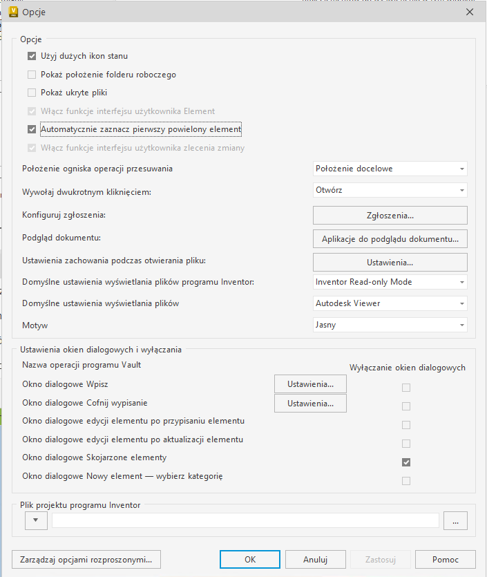 Podczas pracy z plikami programu Autodesk Inventor w programie Vault pliki projektu programu Inventor są używane w operacjach zmiany ścieżki dla plików programu Inventor (np. zmiana nazwy i przenoszenie pliku, kopiowanie projektu lub zastępowanie). Można wybrać, czy ma być używany domyślny plik projektu programu Inventor skonfigurowany przez administratora, czy ostatni kontrolowany przez program Vault plik projektu wpisany do programu Vault za pomocą dodatku Inventor Vault Add-in.