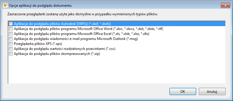 Określ domyślne ustawienia wyświetlania podglądu plików programów Inventor, AutoCAD i innych obsługiwanych typów plików. Domyślnie do wyświetlania plików jest ustawiony program Autodesk Viewer. Wybierz domyślne ustawienia wyświetlania plików: