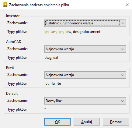 Umożliwia określenie, czy pliki Inventor, AutoCAD i Revit są otwierane przez najnowszą, ostatnio uruchomiona lub tę wersję aplikacji CAD, w której zapisano plik.