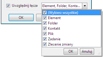 Jeśli wybór obejmuje łącze do wystąpienia obiektu niestandardowego (zadania, kontaktu itp.), zostanie ono użyte do gromadzenia danych plików. Obiekty niestandardowe nie zawierają samych plików, folderów, zleceń zmian ani elementów. Zawierają tylko łącza do tych obiektów, jak również łącza do innych obiektów niestandardowych.