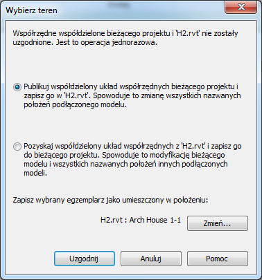 Jeśli połączenie wstawiono przy użyciu opcji położenia Automatycznie — wg współrzędnych współdzielonych, należy wykonać dodatkowe czynności w celu ręcznego skonfigurowania terenu współdzielonego.