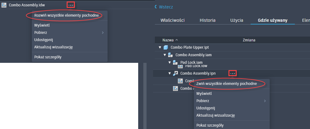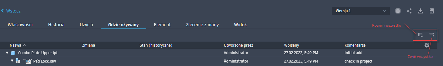 Rozwiń lub zwiń wiersze w widoku drzewa. Ta funkcja jest dostępna na stronie szczegółów Plik (Użycia i Gdzie użyty) oraz Elementy (Gdzie użyty i Zestawienie komponentów).