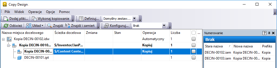 Widok umożliwia uzyskanie dostępu do rysunków i przypisanie do nich poszczególnych operacji kopiowania. Połączona operacja jest oznaczona za pomocą wartości Automatyczny w kolumnie Operacja.