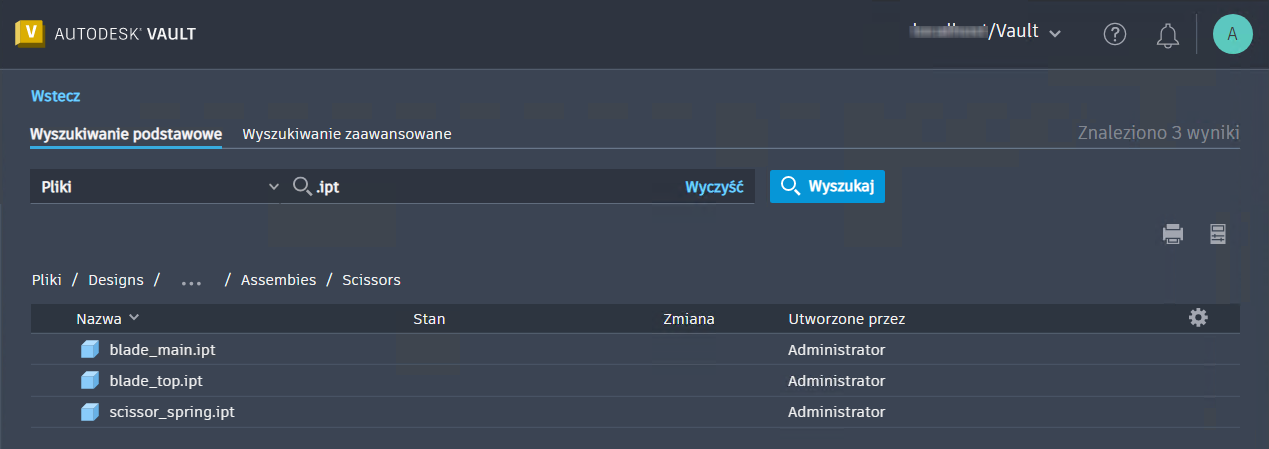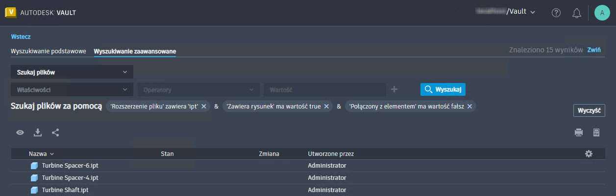 Elementy lub pliki odpowiadające kryteriom wyszukiwania są wyświetlane na stronie Wyniki wyszukiwania. Wyniki wyszukiwania pozostają wyświetlone do momentu wykonania kolejnego wyszukiwania zaawansowanego.