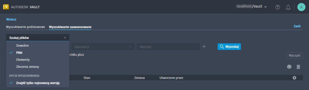 Panel Wyszukiwanie zaawansowane można rozwinąć lub zwinąć, stosowanie do potrzeb. Domyślnie panel wyszukiwania jest rozwinięty.