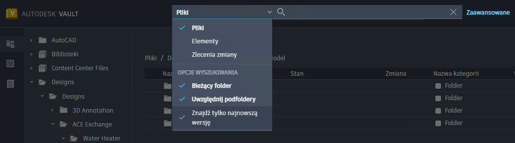 Wybierz opcję wyszukiwania — Bieżący folder i/lub Z podkatalogami lub Znajdź tylko najnowszą wersję. Domyślnie zaznaczona jest opcja „Z podkatalogami”.