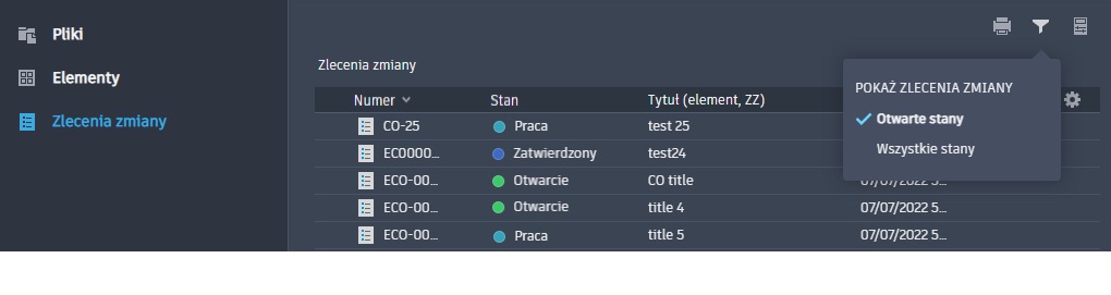 Wybierz filtr „Otwarte stany” lub „Wszystkie stany”. Jeśli wybrano opcję Otwarte stany, wszystkie zlecenia zmiany w stanie Zamknięte lub Anulowane zostaną ukryte w widoku.