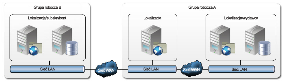 Bieżący stan: grupa robocza A składa się z wydawcy i dwóch lokalizacji.