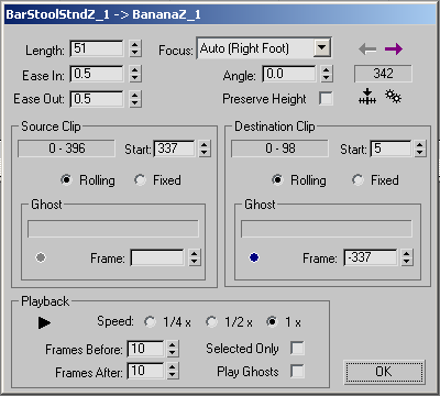 - Fixo Para o clipe de origem, essa opção congela o bípede na posição Quadro inicial durante a transição. Para o clipe de destino, essa opção congela o bípede no Quadro final. Se Fixo for escolhido para os clipes de origem e de destino, a transição será uma interpolação gradual de uma pose congelada para outra.