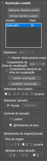 implementação de Parâmetros PRS, clique no botão Rotação. Os parâmetros da restrição LookAt estão presentes abaixo da implementação de Restrição LookAt.