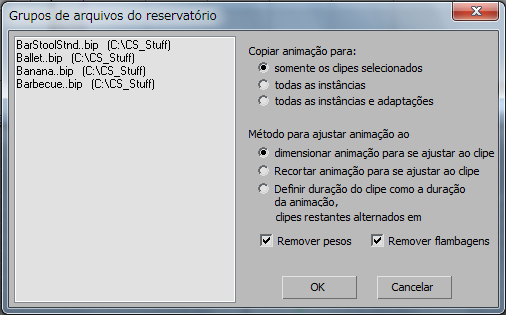A caixa de diálogo Grupos de arquivo do reservatório se abre quando você seleciona os clipes e seleciona Carregar origem