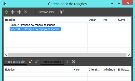 A diferença entre a criação de um estado no Modo de criação ou fora dele é que, no Modo de criação, é possível manipular as trilhas de reação para todos os objetos. Com o Modo de criação desativado, só é possível manipular a trilha de reação para o driver de reação.