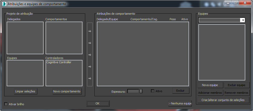 A caixa de diálogo de atribuições de comportamento e equipes permite agrupar delegados em equipes e atribuir comportamentos e controladores cognitivos a delegados individuais e equipes. Ela também permite modificar atribuições existentes.