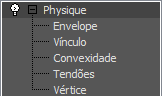 Essa implementação aparece para todos os níveis de subobjeto do Físico. Para todos os níveis exceto vértice, mostra o nome do objeto da hierarquia associado com o link ativo. Para o Nível de subobjeto do vértice, solicita para você "Selecionar vértices", a não ser que Selecionar por link ou Atribuir a link esteja ativo, nesse caso, exibe o nome do objeto da hierarquia associado com link ativo, como faz em outros níveis de subobjeto.