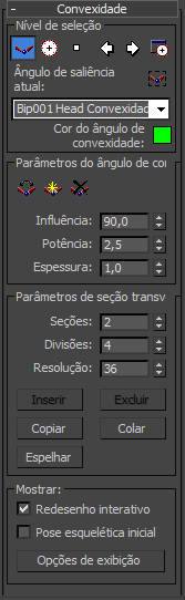 O Editor de convexidades duplica muitos dos controles no nível de subobjeto Convexidade. O benefício do uso de Editor de convexidades é que os dados do ângulo de convexidade são representados graficamente e fornecem uma forma alternativa de criação, seleção e edição de seções transversais. Ao invés de editar pontos de controles de seção transversal nas viewports para "tornar convexa" a malha, pode preferir abrir o Editor de convexidades e mover pontos de controle na vista Seção transversal do Editor de convexidades.