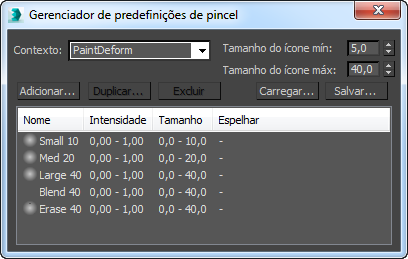 O Gerenciador de predefinições de pincel lista todas as predefinições de pincel, mostrando as configurações específicas do contexto e permite alterar contextos. Ele também permite adicionar, renomear, copiar e excluir predefinições, além de definir o intervalo para a indicação dos tamanhos de pincel na barra de ferramentas. Por fim, ele permite salvar e carregar coleções personalizadas de predefinições de pincel usando o formato de arquivo BPR.