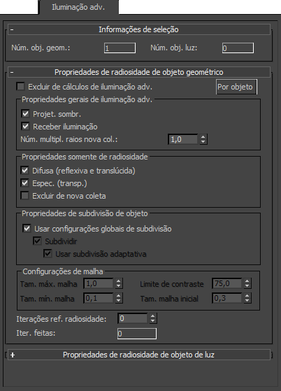 Para obter mais informações no grupo das Propriedades de Radiosidade apenas, consulte Controles de Radiosidade.