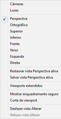 Se a cena contiver câmeras, elas estão listadas nesse submenu. Se não houver câmeras, o submenu não será aberto. Escolher um nome da câmera muda a janela de visualização para o ponto de vista da câmera.