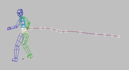 Quando um bípede é animado, você pode visualizar seu movimento não só usando Reprodução de bípede, mas também vendo o caminho, ou trajetória, que o bípede (ou vínculos do bípede selecionados) segue através do movimento.
