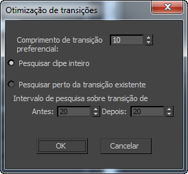 As opções na caixa de diálogo Otimização de transições permitem selecionar o intervalo no qual o algoritmo de otimização procurará para a transição. É possível pesquisar em todo o clipe ou pode procurar junto da transição existente. Deve especificar a duração preferível da transição otimizada. O estúdio de personagens tentará aproximar-se o máximo possível dessa duração, ainda que opte por lhe dar a melhor duração.