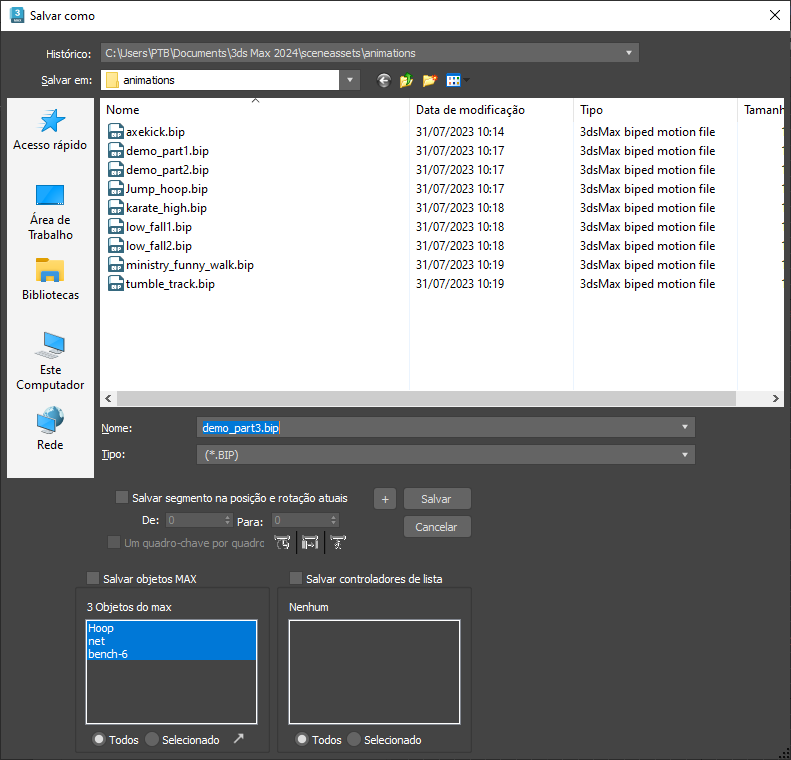 - Todos Quando ativado, todos os controladores de animação associados são salvos com o arquivo BIP.