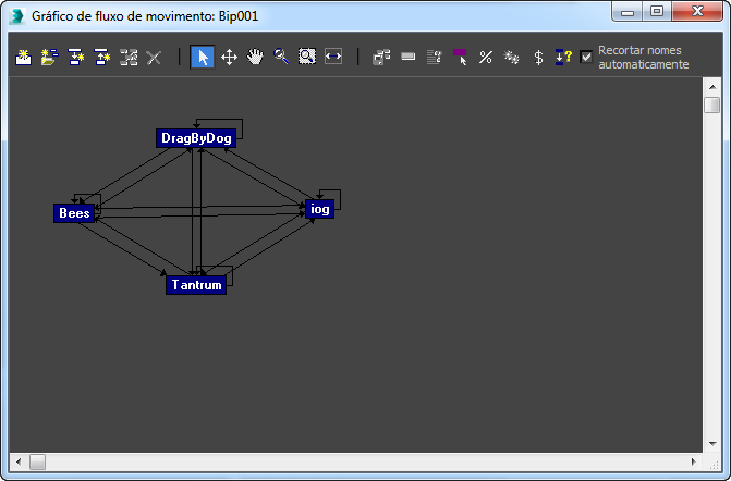 Você cria movimento aleatório adicionando primeiro clipes ao Gráfico de fluxo de movimento e adicionando transições entre os clipes. Em seguida, são determinadas porcentagens para clipes e transições, que são utilizadas para criar movimento aleatório para um ou mais bípedes. Você pode controlar manualmente a "ponderação" de uma possível faixa inicial de clipes, transições e quadros. Isso permite animar vários bípedes em uma cena de multidão, por exemplo. É criado um script diferente para cada bípede.