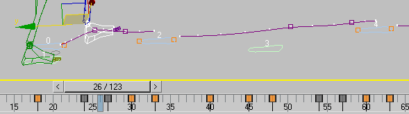 Durante os períodos de cinemática adiante, a trajetória do nó e suas chaves são exibidas em púrpura (as mesmas chaves são exibidas em cinza na barra de trilha).