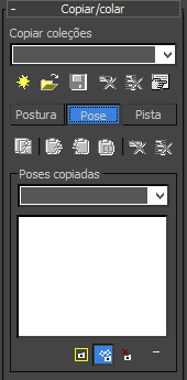 A funcionalidade Copiar pose permite copiar a rotação e a posição de todas as partes de todo o bípede ao mesmo tempo. Ela não compreende dados da trilha de animação, somente as chaves individuais desse quadro, e os botões para copiar trilhas ficam indisponíveis quando Copiar pose está em uso.