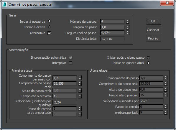 Quando Interpolar for desativada, o parâmetro Último passo ficará acinzentado. O bípede cria todos os passos usando apenas os parâmetros em Primeira etapa.