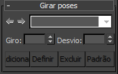 Permite que você escolha uma pose predefinida ou salva para aplicar ao membro selecionado do bípede. Por padrão, cinco poses de torção estão disponíveis para cada membro de três GDL: para cima, para frente, lateral, para baixo e posterior. Também é possível renomear a pose de torção atual.