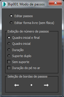 Clique com o botão direito do mouse em qualquer lugar na Footstep em Track View (Dope Sheet) para exibir a caixa de diálogo do modo Footstep. Esta é uma caixa de diálogo modal e pode permanecer visível enquanto você trabalha no Track View.
