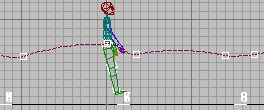Aqui, o centro de massa é movido no plano Z. Agora o calcanhar do bípede nunca toca o chão. Parece que o bípede dá um pulo usando somente os dedos do pé. Aqui, o character studio compreende que você deseja substituir a trajetória calculada e posicionar o quadro-chave por conta própria.