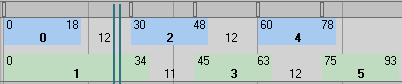 Nesta Vista de trilha - vista Dope Sheet de um movimento de caminhada, os passos são representados por quadrados coloridos, os números de passos aparecem em negrito dentro dos quadrados, entre os quadros inicial e final do passo. Os números entre as caixas coloridas representam a duração do pé no ar.