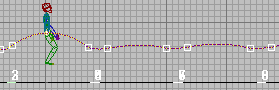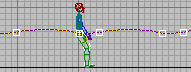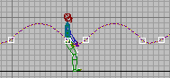 Por causa da Dinâmica de bípede, nenhuma chave é necessária para a parte mais alta desse movimento de salto ou para o mergulho quando o bípede aterrissa. O character studio calcula a trajetória do Corpo. Esta imagem mostra a trajetória do centro de massa. Os quadros-chave são quadrados brancos na trajetória.