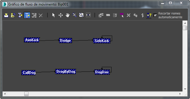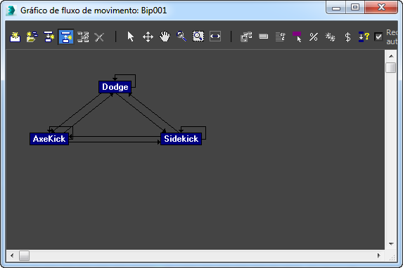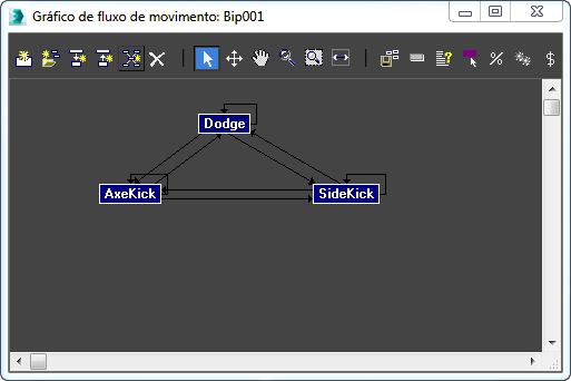 As transições, mostradas como setas, vinculam arquivos de movimento (clipes) para criar mais animação de personagens e simulações de multidão. As transições podem ser criadas manualmente com o Editor de transição ou automaticamente pelo character studio.