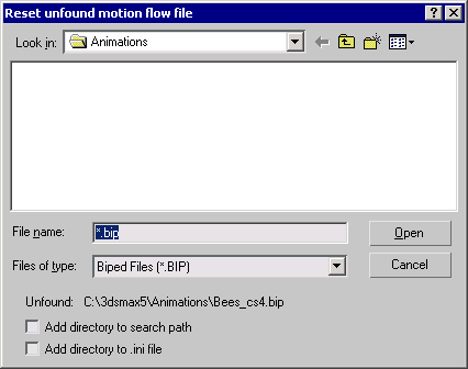 - Na caixa de diálogo Redefinir arquivos de fluxo de movimento não encontrados, direcione o 3ds Max para a pasta na qual o arquivo BIP ausente reside.