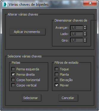 Por exemplo, para selecionar todas as chaves da perna esquerda em um estado Movimento (o estado da perna entre passos plantados), ative Perna esquerda e o filtro Estado de movimento e, em seguida, clique em Selecionar.