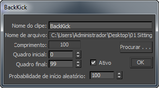 Os parâmetros na caixa de diálogo Propriedades de clipe permitem navegar para um clipe, definir quadros de início e final para o clipe e configurar uma probabilidade de início aleatório do clipe. A probabilidade de início aleatório é usada quando você utiliza Criar movimento aleatório para gerar um script aleatório para um bípede.