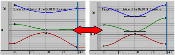 Se você converter uma curva de rotação quatérnion para Euler, as chaves da tangente resultantes são definidas como Suave. Se, por outro lado, você alterar uma curva de giro Euler para quatérnion, a interpolação de Bezier das tangentes é mantida tanto quanto possível. No entanto, se essa interpolação for demasiado extrema e não puder ser correspondida com valores TCB, é então reduzida para se ajustar aos limites de quatérnion.