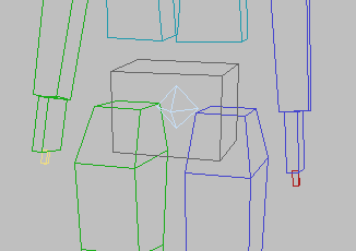 A estrutura do bípede inclui a opção para adicionar até três elementos de apoio. As escoras aparecem ao lado das mãos e do corpo do bípede por padrão, mas, como qualquer objeto do 3ds Max, podem ser modificadas ou animadas durante a cena.