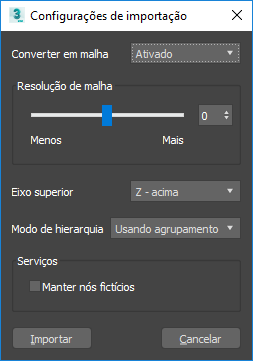 - Define a resolução de objetos, quando importados como objetos de Malha editável. Valores maiores resultam em objetos mais detalhados, que podem exigir mais tempo e armazenamento. Valores menores resultam em objetos menos detalhados. Intervalo = -10 a 10. Padrão=0.
