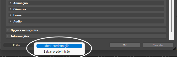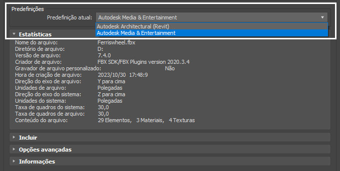 Para obter mais informações sobre a criação e edição de predefinições, consulte Criação de uma predefinição FBX personalizada e Edição de uma predefinição FBX.