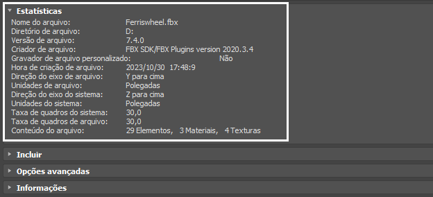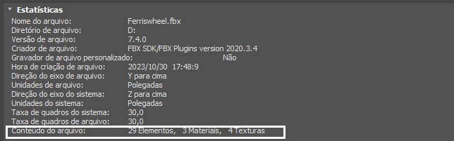 A janela de estatísticas permite a exibição de informação sobre os metadados relevantes das configurações do arquivo de entrada (FBX) e do sistema (aplicativo). As informações variam dependendo do que está no arquivo.
