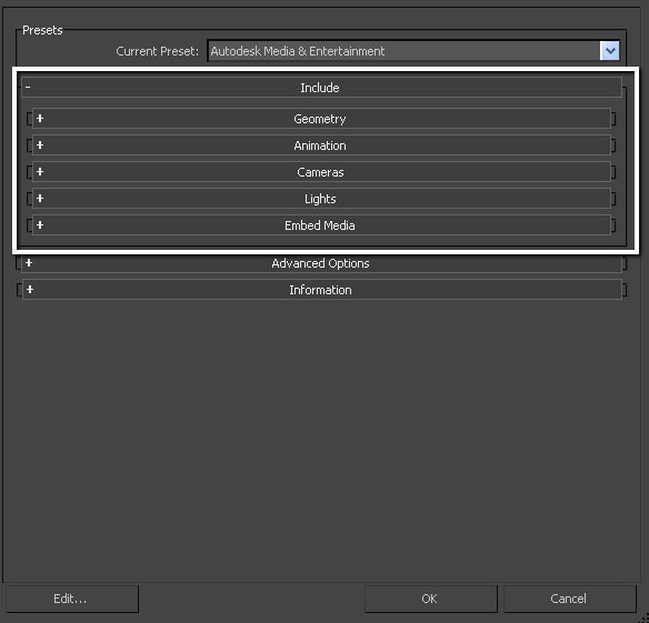 A implementação Incluir permite decidir a quais dados e conversões o plug-in se aplica à sua cena ao exportar a partir de um aplicativo host.