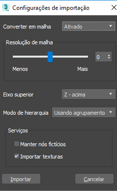 - Define a resolução de objetos, quando importados como objetos de Malha editável. Valores maiores resultam em objetos mais detalhados, que podem exigir mais tempo e armazenamento. Valores menores resultam em objetos menos detalhados. Intervalo = -10 a 10. Padrão=0.