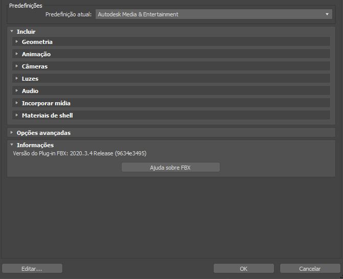 Este capítulo contém informações sobre opções que podem ser usadas na janela de exportação do 3ds Max FBX plug-in.