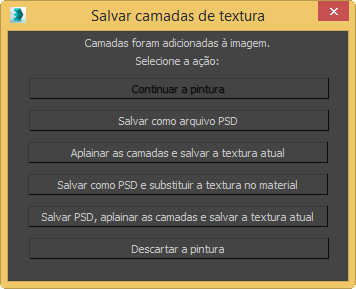 Quando você usar Viewport Canvas para adicionar uma ou mais camadas a uma textura bitmap de única camada, como um arquivos JPEG ou PNG e, em seguida, sair da Pintura ou de outras ferramentas, o Viewport Canvas abre a caixa de diálogo Salvar Camadas de Textura com opções para manipular a imagem. As opções são as seguintes: